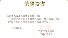 [摘要] 鑒于福州未來者影視廣告公司2011-2013年度杰出表現(xiàn),特入選為連續(xù)三年《中國影視廣告案例年鑒》優(yōu)秀影視廣告經(jīng)營單位。2013/01/22 -